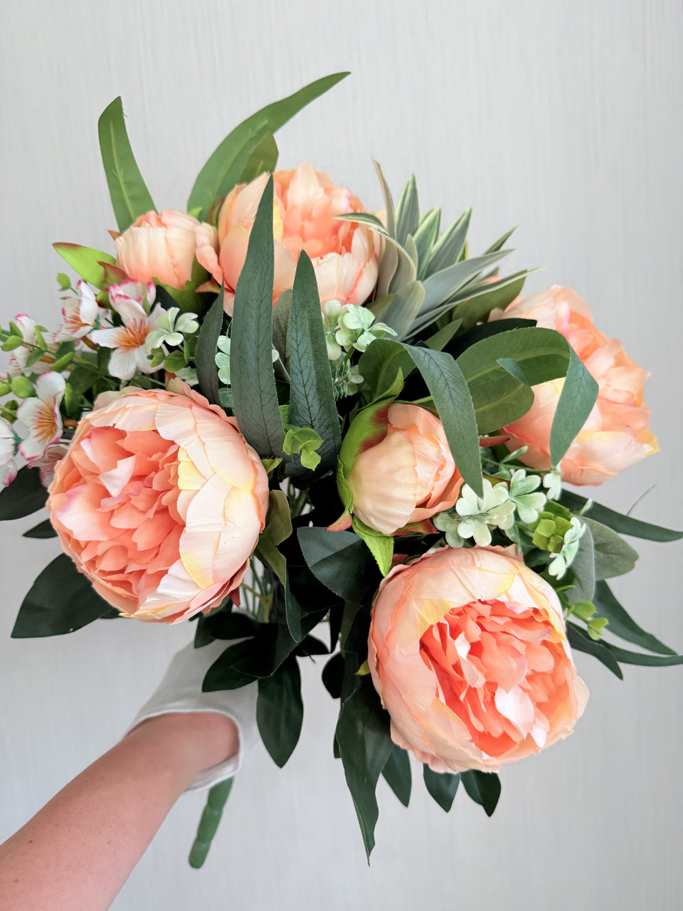 Цей витончений букет стане ідеальним доповненням до будь-якого інтер’єру чи святкового оформлення. Поєднання великих півоній, ніжних бутонів і розкішної зелені створює гармонійну композицію, що вражає своєю реалістичністю та елегантністю.