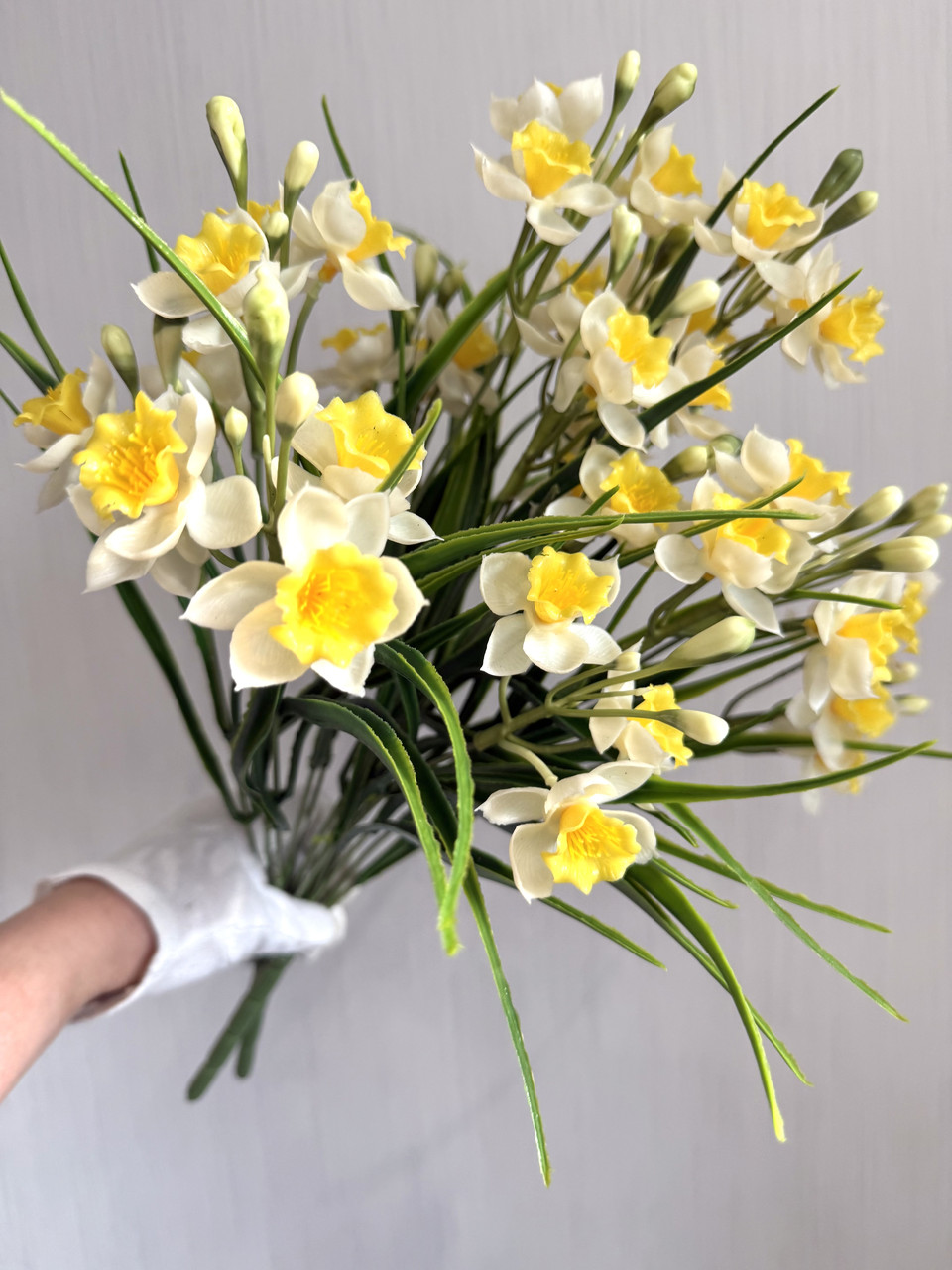 Вишуканий декоративний букет з біло - жовтих гелевих нарцисів — ідеальний варіант для весняного декору чи подарунка. Квітки виглядають дуже натурально завдяки м’якому гелевому покриттю та ретельно проробленим деталям.