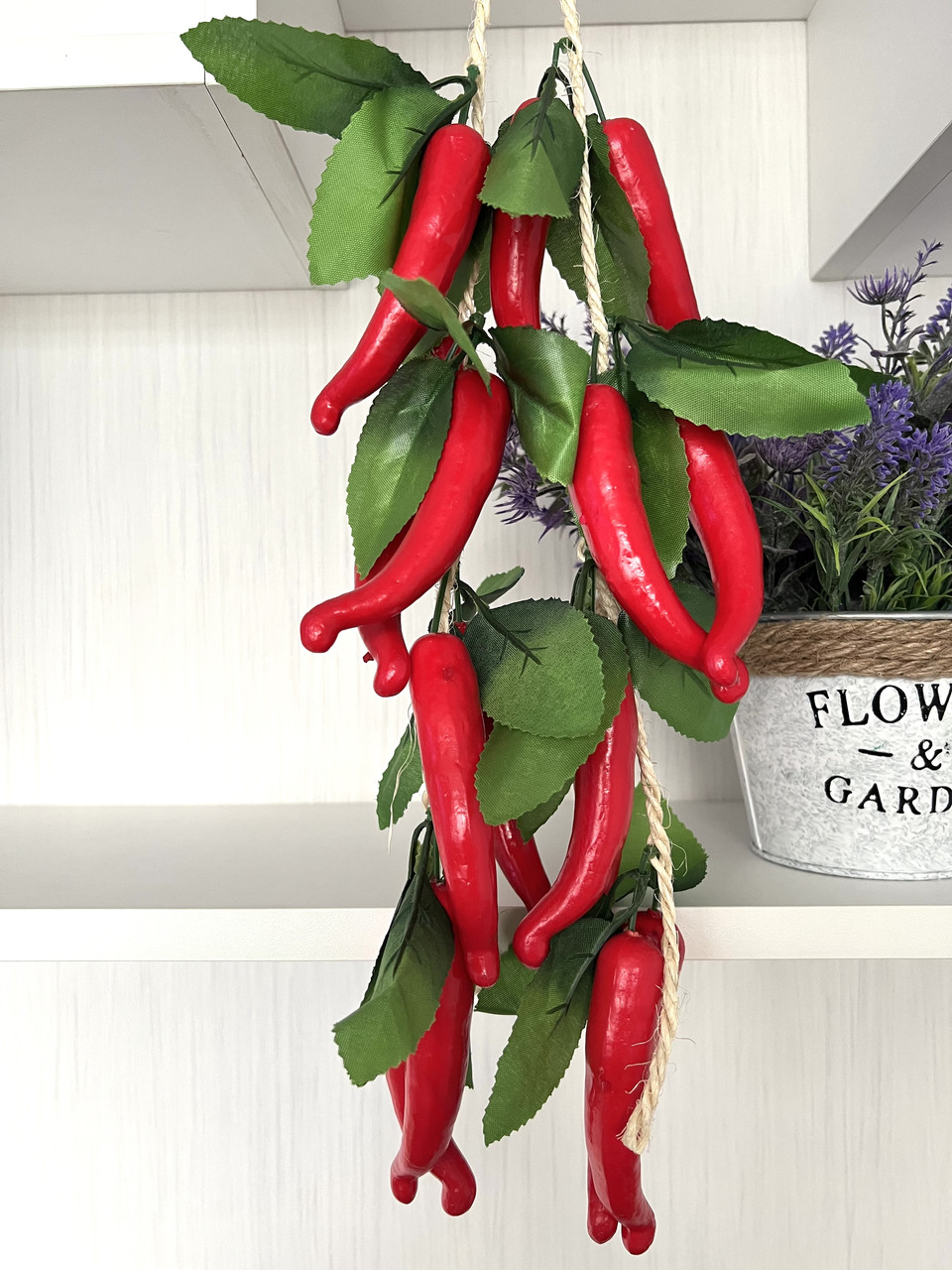 В'язання перцю з листям з 8 шт. Довжина в'язання 40 см.Перець виготовлений із пінопласту.В'язки використовуються для декору літніх майданчиків, каші, вдалих альтанок.