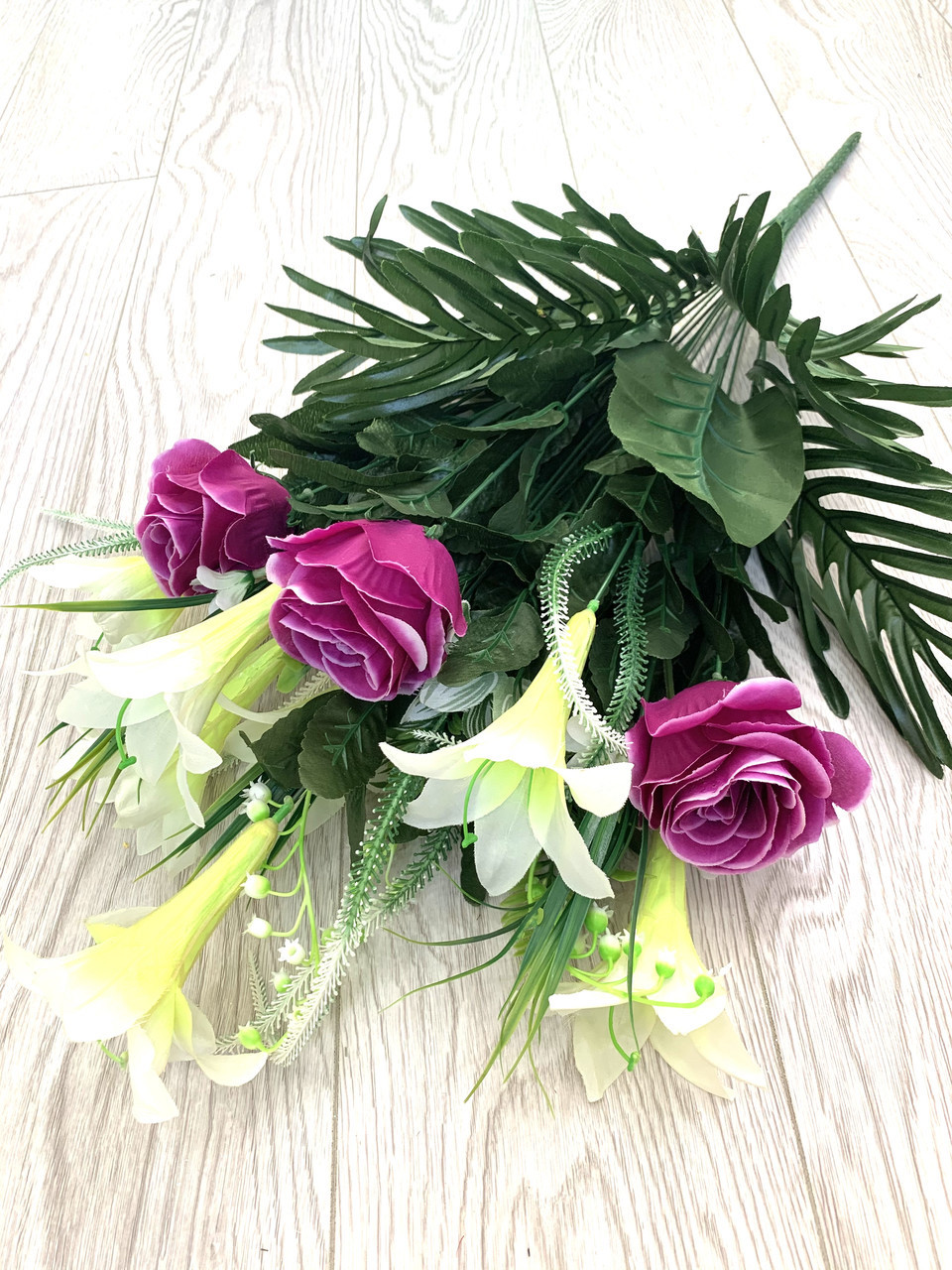 Штучні квіти. Штучний букет троянда з лілією.Букет виготовлений як збірна композиція. У цій композиції зібрані троянди, лілії й безліч різних добавок. Композиція оформлена великим зеленим листям і листям папороті.
